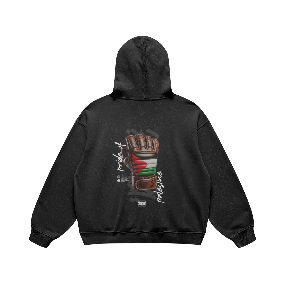 Back Design: A bold Palestine Flag-patterned glove raised in defiance, surrounded by Pride of Palestine typography — symbolizing unity, unstoppable spirit, and cultural pride.